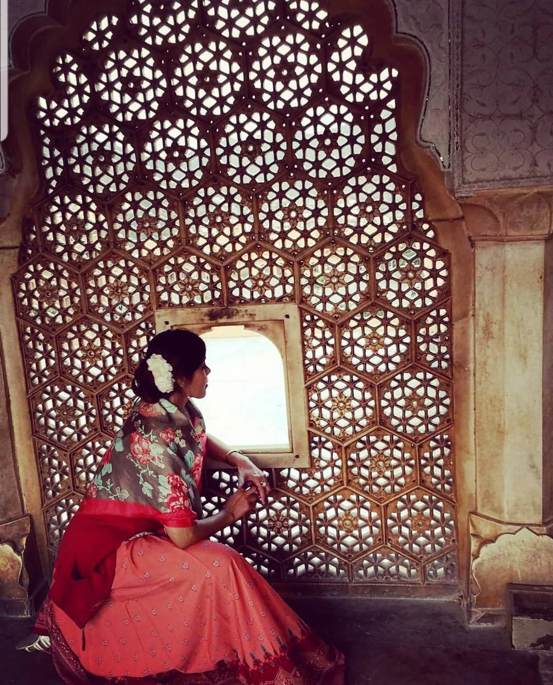 I am seen in the exact same spot where Mughal emperor Akbar’s wife Jodhaa was portrayed as gazing down into the courtyards in the 2008 Bollywood blockbuster Jodhaa Akbar, starring Aishwarya Rai and Hrithik Roshan. This picture was taken during a tour in Jaipur amid the five-day Jaipur Literature Festival extravaganza that I was invited to, in 2018.